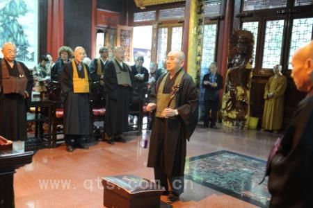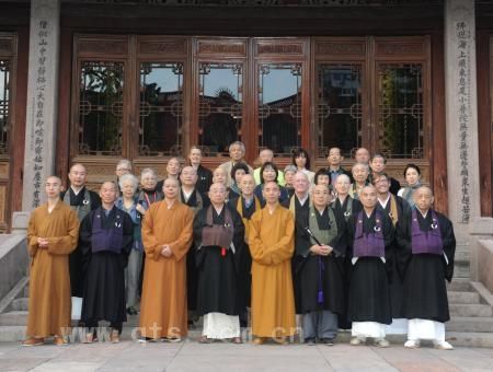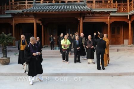 大谷哲夫长老原为日本曹洞宗驹泽大学总长,因长期向往、崇尚中国文化,任期内努力促成驹泽大学与北京大学结成友好学校;近年又发愿“将源于中国的禅文化发扬光大,以此来报答中国与中国文化”,在中日恢复邦交正常化40周年之际,发起成立了“日中禅文化交流协会”。大谷长老曾多次来宁波及七塔道场参访,与可祥大和尚、界义法师等比较熟悉。此次组团来参加天童禅寺举办的“天童禅宗文化研究交流大会”,特意抽空再来七塔禅寺参访故地。下午四时许抵达山门口,在界义法师引领下,参观了各殿堂,在法堂礼佛诵经、祖堂礼祖后,宾主双方在会客厅小坐交流。界义法师首先转达了在北京学习的可祥大和尚对大谷长老等来宾的问候!回顾了3年前为了寺院扩建项目去日本参访“取经”时,与大谷长老等会面交流的愉快情景,又介绍了寺院西北角工程进展情况;随后陪同客人们参观了即将完成的图书馆、禅学堂、大讲堂等建筑。大谷长老对扩建工程建筑设施的庄严完善非常赞赏,表示在工程全面完工时,争取再来七塔禅寺进行祝贺,共襄盛举。最后,宾主双方在圆通宝殿前一起合影留念。