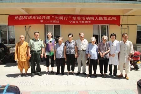 为促进宁波“双拥”工作及慈善事业更好的发展,重点帮助退役老战士、家庭困难的白内障病人早日恢复视力、重见光明,七塔禅寺与解放军第一一三医院共同筹划、发起军民共建“光明行”慈善活动。 可祥大和尚与第一批患者见面 大和尚与医院有关领导会见患者 第一批患者出院合影 送患者回家