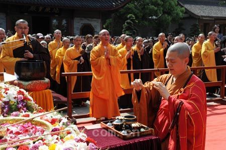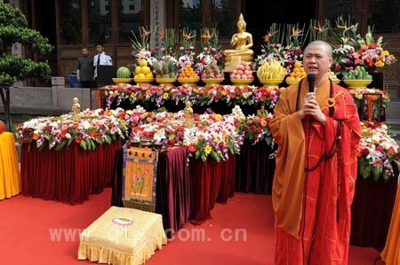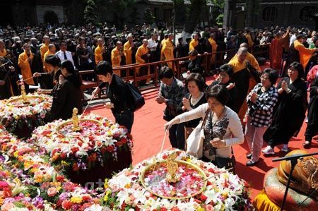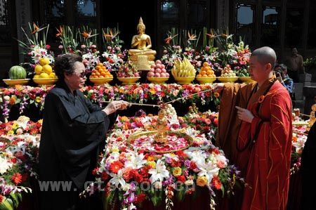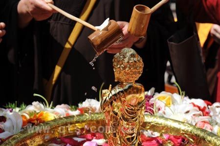 在结束了皈依法会后,于9时许,全体僧众又集结于圆通宝殿前举行神圣的浴佛法会。在唱赞、供佛仪式完成后,大和尚在佛前宣读了祈祷文,祈求世界和平、人民幸福、社会合谐、兵戈永息。随后,在僧众的带领下,与会信众按序完成浴佛,当天法会至此圆满结束。