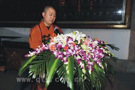 随后,可祥大和尚代表七塔常住致辞。他先介绍说,在即将过去的2011年里,七塔禅寺各项建设取得了一系列显著成绩,“这是寺院常住四众弟子共同努力的结果,是甬城信众护法积极护持的结果,也与各级党委、人大、政府、政协领导的大力支持分不开”,在此向大家表示感谢与祝愿!大和尚说,即将到来的2012年将是不平常的一年,社会上对此有种种传言,但“我们佛门弟子只认真理,从不信邪!佛法讲,‘一切唯心造’,‘十法界不离一念心’。心能创造命运,也能改变命运,只要我们把握住这颗真心,始终保持清静、平等、正觉、慈悲之心,勇于践行自度度他、自利利他的菩萨道,自然会化戾气为祥和,再大的厄运都可以扭转,从而将我们所处的世界转化为安和乐利的人间净土。这是我们的信念,也是我们的祝愿!”大和尚最后号召:“现在,让我们一起敲响这破除迷梦的吉祥之钟,让这洪亮的钟声带着我们真诚的祝愿,迅速传遍大千寰宇,荡涤一切污浊晦气,开辟出一个有情乐享的朗朗乾坤!”