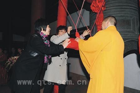 午夜零时整,陈勤俭主席、市委统战部郁伟年部长与可祥大和尚一起敲响了新年的第一记吉祥钟。浑厚嘹亮的钟声划破甬城的黑夜,开启了2012新春的脚步,与会者激动振奋,掌声宏贯整个殿堂。随后,107记吉祥钟声伴随着美好的祝福,按顺序依次响起;最后由未领到编号的来宾随喜撞钟,以寄托自己新年的心愿与祝福,钟声一直持续到零点30分左右。