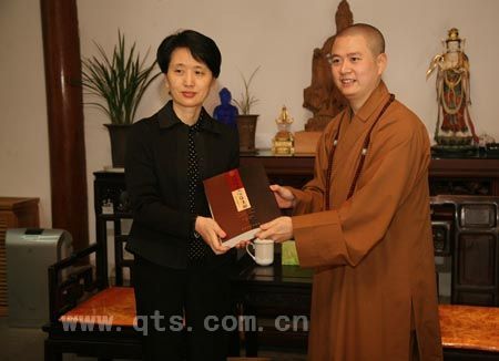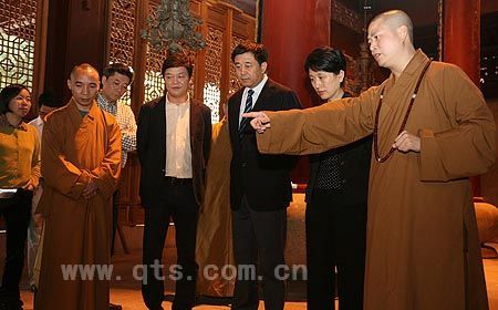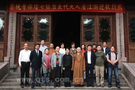 11月1日下午,浙江省人大代表宁波中心组第三联组12名成员,在省人大副主任冯明女士、江东区人大主任于海平的带领下,前来七塔禅寺视察工作,随后考察了开发建设中的东部新城。 介绍寺情 参观殿堂 在同组代表可祥大和尚的陪同下,冯主任等依次参观了天王殿、圆通宝殿、三圣殿、法堂及开祖心镜禅师舍利塔等各殿堂,听取了可祥大和尚的相关解说,最后在方丈室进行了座谈。可祥大和尚向代表们简要介绍了七塔禅寺的历史沿革,寺院的建设与管理现状,以及今后的发展理念和方向等,重点说明寺院的建设管理是本着“保护为主、精修为旨、艺术为重、和谐为本、修缮与保护并重”的理念,以为在尘世中纷扰的人们创建一个“梦中的故乡、心灵的彼岸、精神的家园”。冯主任等对寺院的管理建设与发展规划表示赞赏,对七塔禅寺殿堂的庄严明亮、寺容的干净整洁、道场的安静祥和深感钦佩,深信七塔寺在可祥大和尚的带领下,一定能建设成为一个道风优良、法运昌隆的佛教道场,以为宁波市的人文建设增色添彩。 座谈交流 赠送礼品 合影留念