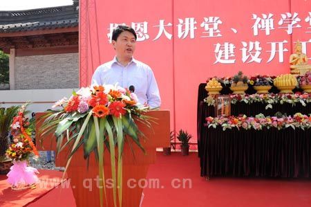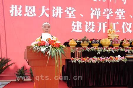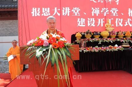 9时整,开工仪式正式开始,由七塔禅寺监院界义法师现场主持。首先,可祥大和尚向与会大众介绍了此项工程的概况和重要意义,回顾了10年漫漫的落实土地、设计方案、报批手续历程,三个阶段艰辛的筹备过程,在此过程中,得到了市、区两级党委、人大、政府、政协等部门领导的重视与大力支持,特别是市、区统战部、民宗局,市、区规划局,市、区交警队,区城管局、重点办、百丈街道等单位的帮助和指导,以及俞维东居士等护法的鼎力相助,终于使工程于今日顺利开工,功德初步圆满。大和尚由此代表七塔常住,对以上单位与个人表示衷心的感谢!并希望施工、监理单位坚持高起点、高标准、高质量、高品位的原则,严把工程建设质量关,科学施工,严格管理,确保工程按期完成。随后,市民宗局陆立宪局长发表讲话,对此项工程的正式开工表示热烈的祝贺,称此为七塔禅寺发展历史上的一件大事,亦是宁波佛教界的一大盛事,显示出天时、地利与人和,“标志着七塔道场建置更完善,功能更齐全,千年古刹更显恢宏与庄严”;希望寺院与建设单位协调好各方关系,加强科学管理,在确保安全的基础上,把此项工程建设成一流的精品工程。