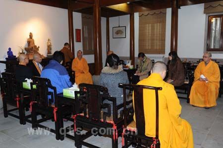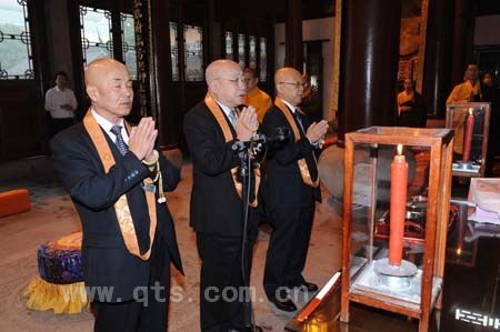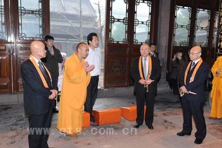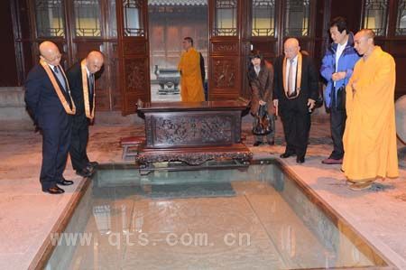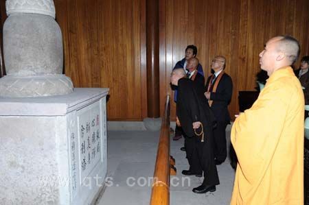 上午9时许,阿纯孝总长一行冒雨抵达七塔禅寺,在界义法师等执事的引导下,进入圆通宝殿,与常住僧众会面。在众僧以梵呗颂赞致欢迎礼后,客人们在佛像前献礼供佛,并诵日文经典以示祝愿。仪式过后,界义法师陪同客人先后参礼了圆通宝殿、三圣殿、舍利殿等主要殿堂,依次重点介绍了南宋铜钟、清代五百罗汉石刻图、明代荷花拜石、唐代开祖舍利塔等文物珍宝,得到客人的赞叹。