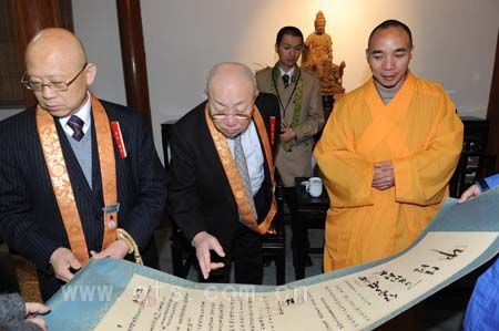 最后在方丈会客厅,界义法师以茶待客,宾主双方进行了友好交流。界义法师向客人们简要介绍了七塔禅寺的历史沿革,以及即将开工的寺院二期工程建设等情况,针对客人们提出的对我寺僧众的学习情况、出家受戒条件以及寺院派别现行情况等问题,给予了令其满意的答复。期间,特别向客人们展示了来自日本的《唐贞元明州牒》复制件,引发客人们的欢喜赞叹。阿纯孝总长对七塔禅寺的建筑、文物、历史、文化等表示了浓厚的兴趣,对“普门柱”的建筑理念给予了高度的赞赏与评价。