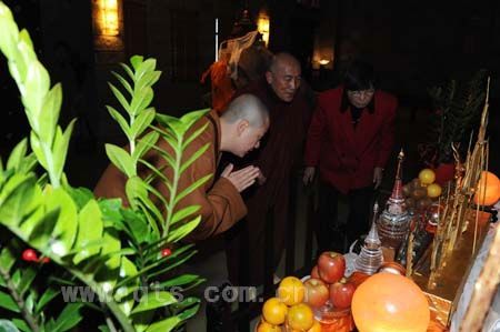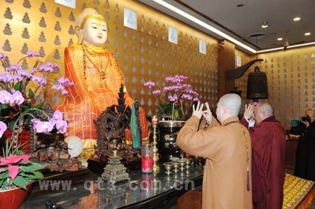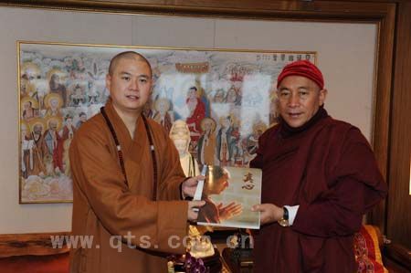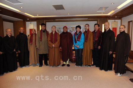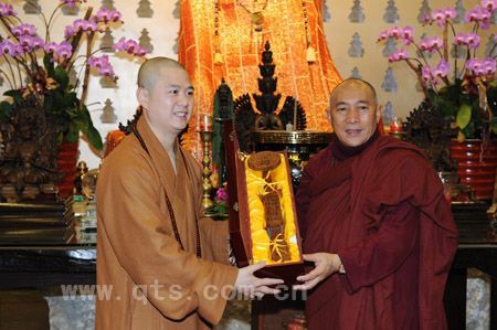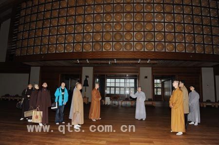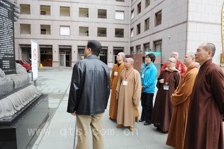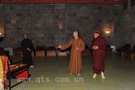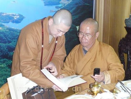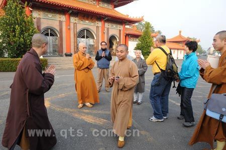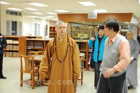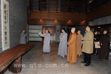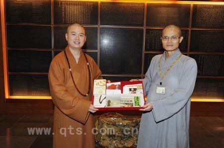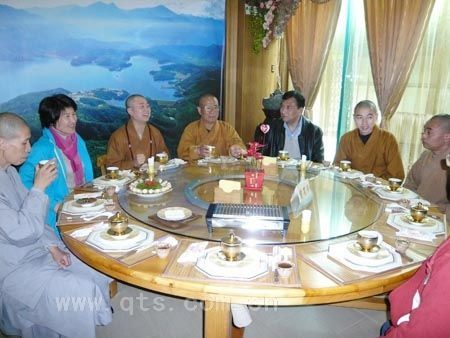 在佛前供灯后,参访团成员在心道法师等的陪同引领下,参观了各主要殿堂,及心道法师当年闭关苦修的法华洞,瞻礼了佛陀及十大弟子舍利,颇多感慨!中午时分,心道法师安排精致素餐款待,特意请来一名良厨负责烹饪,又邀请道场护法、社会名人叶金凤老居士作陪。席间交流时,心道法师谈到,当前台湾佛教界以教育弘法的比较多,以修行弘法的比较少,灵鹫山走的是后一条道路。因为修行弘法比较实在,通过修行可以改变自身气质,改善思维习惯,转化心灵意识,开发出般若智慧,然后就可以稳妥弘法,广度众生。如有人看不懂《金刚经》,通过禅修后,自己会看了,也会给别人讲了。此外,佛教界还可以与其他宗教联合,一起为当前存在的诸如生态、环保、道德、慈善等社会与心灵方面的问题探求解决方案,讲和平、讲和谐、讲包容,求同存异,彼此尊重。为此,灵鹫山常住特意在台北创办了世界宗教博物馆,得到了国际宗教界人士的广泛认同与欢迎。可祥大和尚对此深表赞赏。临别,双方互赠了礼品,心道法师向可祥大和尚等赠送了《真心》、《灵鹫山外山》等书籍及《和平零时差》光盘资料,并为每人亲笔签名留念。