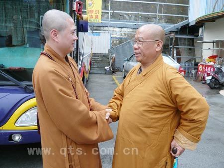 次日上午,驱车前往新北市福隆灵鹫山道场,拜访心道法师。灵鹫山与印度佛教圣地同名,因此处亦有一山嘴形似鸟喙,心道法师于1983年在此闭关苦修,悟道出关后,遂于此处创立了“灵鹫山无生道场”。此后规模逐渐扩大,成为台湾著名道场,信徒逾30万人。车到山腰时,天下小雨,换乘道场专车,至主殿门口,见心道法师率僧俗四众弟子在此列队恭候,以鲜花相迎,令人非常感动!在殿内举行的欢迎仪式上,心道法师深情地回忆道,数月前带团去普陀山迎请毗卢观音圣像时,慕名到“小普陀”七塔禅寺参访,得到了可祥大和尚等的盛情接待,至今记忆犹新。今天大和尚率团来台湾参访,首先选择到灵鹫山无生道场,这是本道场的荣幸!可祥大和尚随后感谢致辞,说自己几年前到过印度,冒雨参拜过世尊当年演说《法华经》的灵鹫山道场,今天来到台湾灵鹫山,天也在下雨,感觉就和当年一样祥和,这都是心道法师领众修行、弘传正法、续佛慧命的功德之所成就。灵鹫山道场名为“无生”,取无生无灭、无生无死之义,乃是诸法实相、涅槃境界,诸佛不动之体,系正法所在之地,令人向往敬慕!今日亲眼目睹,确实名不虚传,值得我们借鉴学习。