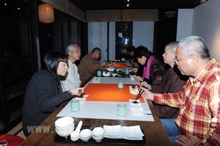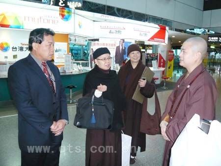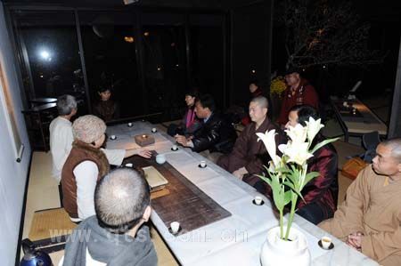 台北花博会留影 居士义工热情导游介绍 24日上午,参访团成员乘坐高铁返回台北。午饭后,观赏了在此举行的世界花艺博览会。张居士为此特别邀请了义工张凤仙居士,为大家提供了热情周到的解说服务。傍晚时分,前往台北县汐止市郊山林间的食养山房,与林谷芳教授等会面,领略了富含自然风韵与人文内涵的山房美景,品赏了一场别开生面、意趣盎然的茶艺晚宴,使大家大开眼界,回味无穷。 品尝食养山房佳肴 品茶赏艺 论道谈心 席间,林教授谈到上次在七塔古刹成功举办禅茶会的心得,结合自己到各地参访的体会,觉得浙江的杭州、宁波等地,自然环境雅致,人文积淀深厚,是最适合举办此类雅集活动的地方。他说,在台湾,纯粹的“学者”缺乏影响力,书卷气太浓的学者有“趣”的不多,只有“行者”才会得到社会认可,“学者+行者”型是最好的,重点在于学以致用,在于德行修为,以及对社会的贡献大小。可祥大和尚对此深表赞同,表示七塔道场的发展理念中就有“以教育培养人才,以文化确立品位,以道风赢取信众,以慈善回报社会”的规条,常住不仅要加强自身修行、弘法力度,将来还要多举办类似禅茶会的活动,要与文化界、艺术界加强交流,将目光投向各大中专院校青年学子及少年儿童,举办各种夏令营、冬令营、研修班等,进行佛学、禅法修持,以资提高佛教界人士整体素质,充分发挥佛法、禅学在净化人心、和谐社会等方面的积极作用,扩大两岸间的交流互动,为社会作出佛门弟子更大的贡献。林教授非常赞赏可祥大和尚的设想和理想,表示会积极配合大和尚,为此宏愿的圆满尽一份力。 机场送别 25日,圆满完成计划的参访团起程返回杭州。在桃园机场,遇见灵鹫山心道法师特意派来的性月法师等在此等待送别,并带来礼物,使人感动不已!此外,机场还有一位工作人员为灵鹫山护法弟子,几天前曾接送参访团入关,此次又负责护送到登机口附近,安排妥帖后才离开,足见心道法师的慈悲入微情怀! 此次参访活动,开阔了眼界,增长了学识,亲身体会了两岸佛教“同根同源、亲如一家”的殊胜情谊。参访的成功原因,在于可祥大和尚、顾卫卫副局长的组织有方,参访团成员间的通力合作,张子树居士等热忱周到的服务安排,几处道场长老及常住的热情接待与积极响应,几位义工及食养山房员工的悉心服务等。大家的普遍感觉是,台湾自然环境比较整洁,佛教文化味道比较浓厚,比较看重修行,信众文化层次较高,对信仰富有实践精神,这些都是值得内地学习借鉴的;两岸加强互动交流,可以取长补短,彼此促进、提高,这应该成为整个佛教及社会各界的努力发展方向,成为两岸人士的共识。