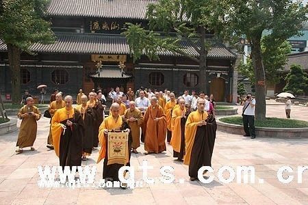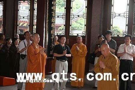 中午11时30分,传印长老一行抵达七塔禅寺三门前。顿时,寺内钟鼓齐鸣,由香盘、双引罄引路,两序大众齐唱本师释迦牟尼佛圣号,恭迎传老一行经天王殿到达主殿圆通宝殿。维那师起《炉香赞》,传老拈香礼佛毕,大众一同顶礼传印长老。
