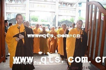 中午11时30分,传印长老一行抵达七塔禅寺三门前。顿时,寺内钟鼓齐鸣,由香盘、双引罄引路,两序大众齐唱本师释迦牟尼佛圣号,恭迎传老一行经天王殿到达主殿圆通宝殿。维那师起《炉香赞》,传老拈香礼佛毕,大众一同顶礼传印长老。