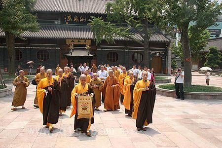中午11时30分,传印长老一行抵达七塔禅寺三门前。顿时,寺内钟鼓齐鸣,由香盘、双引罄引路,两序大众齐唱本师释迦牟尼佛圣号,恭迎传老一行经天王殿到达主殿圆通宝殿。维那师起《炉香赞》,传老拈香礼佛毕,大众一同顶礼传印长老。