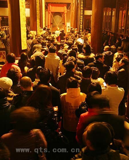 2009年12月31日晚上,气宇恢宏、富丽典雅的圆通宝殿显得格外肃穆庄严。殿内香光凝瑞,气氛祥和,悬挂于殿内东侧的南宋梵钟,在红绸的映衬下耀眼夺目,与大众一起静待着迎接新年的到来。11时30分,2010年元旦撞钟祈福活动正式开始。出席领导有江东区政协主席陈勤俭女士,江东区政协副主席、区委统战部部长李盛潮先生,区委统战部副部长、区民宗局局长赵跃进先生等。