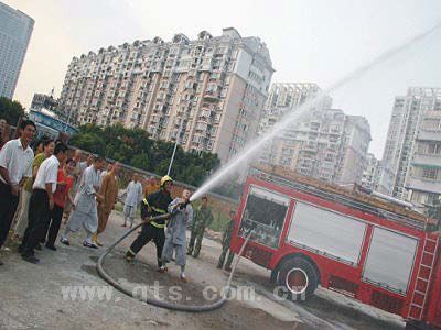 讲座结束后,大家来到西北角空地举行消防演习。此时,江东消防大队已来了三名消防战士和一辆消防车,空地上已生起了一堆柴火。首先大家在消防战士的介绍下,了解了消防车上的灭火器材和使用方法。接着消防战士带领大家使用灭火器进行灭火演习。最后再使用消防车上的消防水枪进行灭火演习。