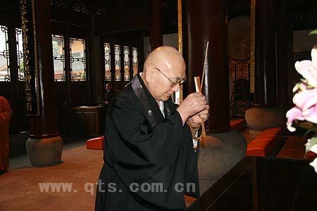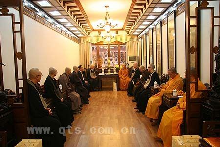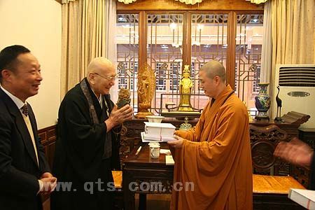 在可祥大和尚等陪同下,南泽道人一行依次参拜了各主要殿堂,随后,宾主双方在法堂东客厅进行了友好交流。可祥大和尚首先代表七塔禅寺常住,对南泽道人一行表示欢迎!随后回顾了佛教在中日文化交流中的重要作用,而在两国佛教交流中,宁波占有重要地位。如日本的临济宗和曹洞宗,都与宁波天童寺有着非同寻常的渊源,日本临济宗与曹洞宗开祖——荣西禅师与道元禅师,都曾求学、得法于天童禅寺。尤其是道元禅师,于1223年入宋求法,1225年在天童寺师从如净禅师,得其曹洞宗禅法真传,回国后开创了日本曹洞宗,在日本佛教派别中最为兴盛。并于福井县越前开创了永平寺,成为日本曹洞宗大本山,其禅林轨制一依祖庭——宁波天童寺,一心打坐的禅风传承至今,长盛不衰,令人钦敬。可祥大和尚说,去年本人曾率团访问日本,拜访贵寺,见道场庄严、禅韵犹在,很是欢喜;对永平寺僧众缅怀祖德、知恩报恩的遗风很是感动。今天诸位为礼祖追源,来宁波参加如净禅师示寂780周年法会,因此相聚在七塔禅寺,因缘十分殊胜,本人再次表示热烈的欢迎!同时希望我们大家继承先贤们未尽的事业,共同加强宁波、中国与日本佛教界的友好交流,为中日两国、乃至世界的永久和平贡献力量。