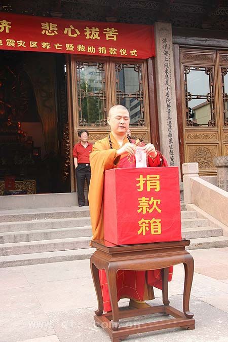 5月12日下午,四川汶川县境内发生7.8级特大地震,波及范围广泛,伤亡人数上万,损失极其严重。应邀在湖州参加寿圣寺界隆法师升座法会的可祥大和尚得悉此讯,当即电告监院界义法师、定昌法师,安排好荐亡佛事及募捐准备。14日结束湖州活动后,可祥大和尚迅即赶回甬城,主持了此次活动。江东区民宗局张志军局长等亲临现场,参加了募捐活动。