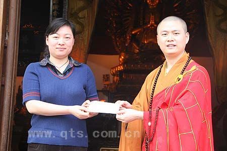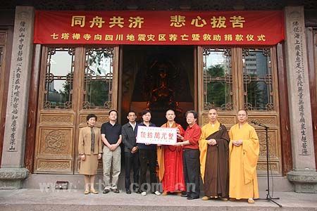 随后,可祥大和尚代表七塔常住,向灾区捐款50万元。宁波神化化学品有限公司副总经理倪敏敏女士受总经理袁维芳之托,通过七塔禅寺向灾区人民捐款10万元。七塔常住两序大众,以及得讯赶来的信众近200人,捐款45510元。三项善款共计645510元,并于5月15日通过中国红十字总会,汇往四川灾区。
