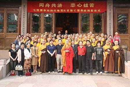 2008年5月14日下午3时,七塔禅寺常住四众在圆通宝殿庄重举行了为四川地震灾区荐亡超度法会,以及向灾区募捐救助活动,共得善款645510元。