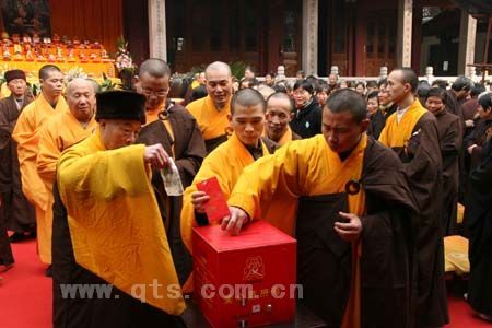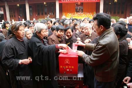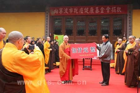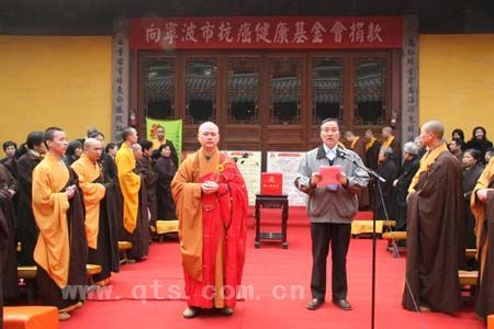 12月5日上午10:30,七塔禅寺在三圣殿前庭院举行了向宁波市抗癌健康基金会捐款活动。四众弟子共300多人参加了此次献爱心活动,向全市癌病患者共捐善款12814元。