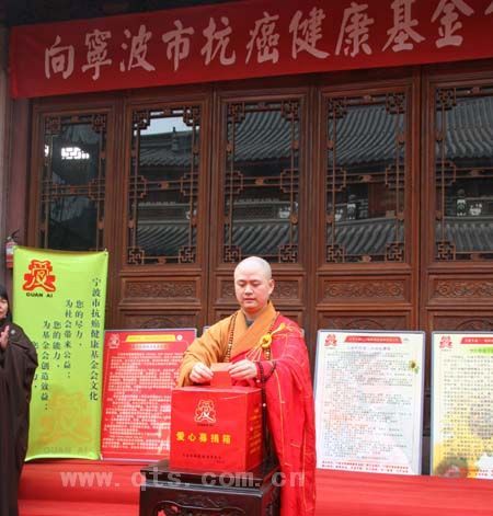 宁波市抗癌健康基金会秘书长杜学初先生随后向大家介绍了基金会概况:宁波市抗癌健康基金会成立于2006年8月,是一个地方公募性的、专业化的癌症慈善基金会,以“关爱生命,共创和谐”为宗旨,积极动员各方社会力量,群策群力,共襄善举,帮助宁波困难的癌症患者和患者家庭战胜病魔,走出困境;并通过有组织的、系统的宣传,来提高民众抗癌防癌的能力,提高全民的健康意识和水平,弘扬中华民族的优良传统,为发扬人道主义精神,为促进社会公共事业的健康发展,共同构筑和谐社会贡献力量。创建一年多来,得到社会各界的支持,为一大批癌症患者和家庭提供了帮助,得到社会的一致好评。杜学初秘书长最后说,今天七塔禅寺的法师和居士们行菩萨之举,通过基金会为全市癌病患者献爱心,我谨代表基金会全体同仁,向你们致以崇高的敬意和真诚的感谢!