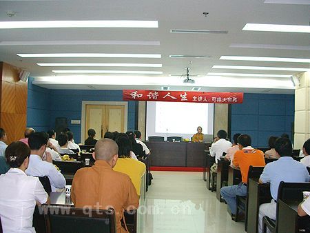 应宁波市青年联合会之邀,本寺方丈可祥法师于8月16日下午3时,在宁波市科技园区甬港现代铭楼为45名市青联委员开示“和谐人生”。法师分别从“传统儒、道对和谐的诠释,佛教对人生不和谐的探讨,如何树立人生之三种和谐观,和谐人生、从心开始”等五个方面,条理清晰,层层推进,深入浅出地向委员们讲述:“和谐是古往今来人人所追求的目标,但人生受烦恼所缚,多半处在不和谐的状态。如何和谐人生,那就要从心开始,佛经有云:‘若菩萨欲得净土,当净其心;随其心净,则佛土净。’只有净化我们的心灵,转变我们的思维模式,树立起正确的世界观、人生观、价值观,处理好身与心、人与自然、人与人之间的关系,才能趣向和谐圆满的人生。”法师还列举了很多现实生活事例、佛经故事、禅宗公案等,让大家更直观地去了解自心,体悟人生。近三个小时的开示,博得全场多次掌声。