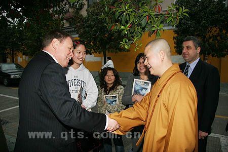 4月5日下午,春光明媚,和风抚面。来宁波参加国际家居博会的格鲁吉亚驻华大使米哈伊尔·乌克列巴、参赞约瑟布·阿巴什泽和立陶宛驻华大使罗卡斯·贝尔诺塔斯及夫人一行莅临七塔禅寺访问,受到可祥大和尚等的热情接待。在佛前敬香后,宾主双方在丈室会客厅进行了友好交流。