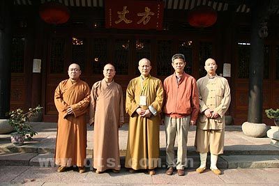 监院传道法师、定昌法师、副寺隆声法师与明海大和尚等合影留念