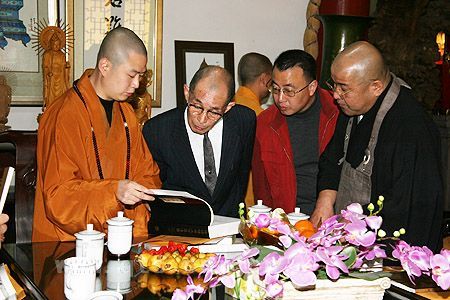 最后,可祥大和尚向村上博优先生等赠送了《七塔禅寺五百罗汉图》、《报恩》杂志等资料礼品,宾主双方在方丈殿前合影留念。