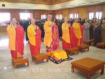 8时30分,在诸山长老及四众弟子的簇拥下,宏正法师手扶拄杖在山门说法后进入大殿,驻立在大殿佛像前赞颂佛德。说法毕,先后由常州天宁寺松纯大和尚向宏正法师挂佛珠、如皋定慧寺恒岳大和尚送位、台湾真华长老送香板、纽约仁俊长老送如意。随后,宏正大和尚在大殿上香供佛,感恩三宝加持,龙天护佑。