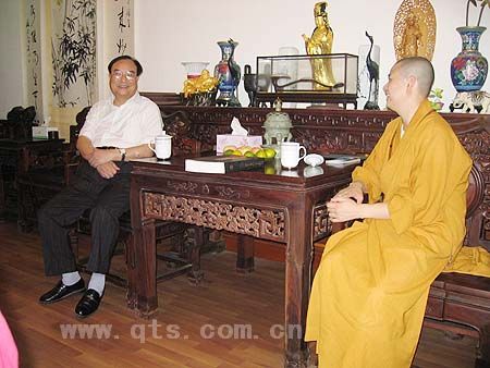 张浚生先生曾担任新华社香港分社宣传部副部长、部长及至副社长和新华社香港分社发言人,1998年起任合并后的浙江大学党委书记,2004年7月离职,现任浙江大学发展委员会主席、浙江省政府经济建设咨询委员会主任等职。此次到宁波考察工作,慕名前来七塔寺参访。在可祥大和尚和监院定昌法师等人陪同下,张浚生先生一行依次参观了新山门牌楼、新鼓楼观音像、各主要殿堂及文物室,对七塔寺的寺院建筑成就、塑像风格、文物档次及文化建设等十分赞赏。最后在方丈殿,双方进行了友好的交流座谈。