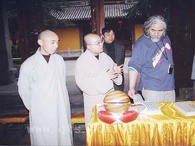 最后,传道法师向张纪中先生及鲍尧品副书记等赠送了《七塔寺志》及《七塔禅寺五百罗汉图》大型画册并合影留念。