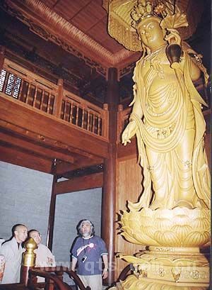 张纪中先生一行在界义、传道法师等陪同下,依次参观了新建的山门牌楼、天王殿、圆通宝殿、鼓楼、三圣殿、“栖心一览”文物陈列室等。圆通宝殿内的五百罗汉石刻图、鼓楼内精雕的十一面观音菩萨圣像、文物陈列室所藏的各种珍贵佛像、文物等,都给张纪中先生留下了深刻印象。
