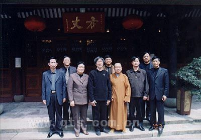 传道法师与领导们在方丈前合影(左二起陈风娇、何蕙忠、传道法师)