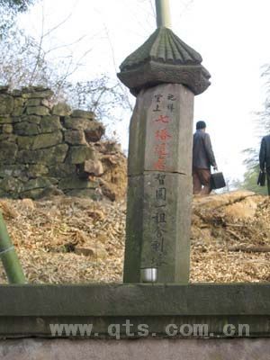昨天,记者乘车来到位于山脚下的鄞州区五乡镇同岙村,再沿着崎岖的山路步行30分钟,来到一个叫庾山岭的小山岙。山岙三面环山,山上长满了胳膊粗的毛竹,正中间有两间农舍。农舍的后面是十多级保存完好的石阶,这些石阶都是由2米多长的石条组成。沿着石阶而上,就到了地宫,地宫上面的石盖已被人盗走,里面全是枯枝败叶。离农舍不到几十米的地方,一行人发现了第一座灵骨塔,在灵骨塔的前面有精美的石雕,可惜已经被损坏得只剩下一半。灵骨塔的塔碑上写着“指南大师塔铭”等字样,碑文还简单记载着抗日战争时期,七塔寺僧人打开地宫,用里面的东西救济周边百姓的事。其后,每走出几十米,就会有一座高僧的灵骨塔出现,记者粗略计算了一下,这个塔院里足有30多座灵骨塔。塔院的周围,有一堵椭圆型的石围墙。在围墙边上,还挖出了一块长约1米的石碑,碑上写着“七塔禅寺塔院界”几个大字。