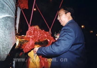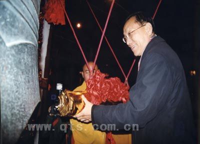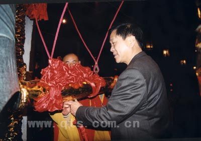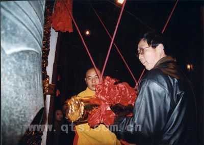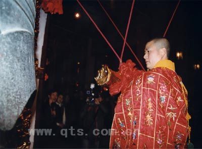 随着新年零点的渐渐临近,在场所有人的心情越来越激动。当零点时刻进入倒计时,身披大红祖衣的可祥大和尚缓步迈上布置庄严的撞钟台,轻轻地扶住撞椎;在场大众随着主持人传道法师的声音一起计数:“十、九、八、七、六、五、四、三、二、一,撞!”“咚——”浑厚吉祥的钟声掠过人们的耳边,穿出大殿,划破暗夜长空,久久回荡在悠悠天际。人群再一次响起热烈的掌声。在场信众个个笑逐颜开,喜不自禁,纷纷欢快地依次上撞钟台,将自己新的一年里所有的祝福和愿望,都融进那一记吉祥的钟声之中……。