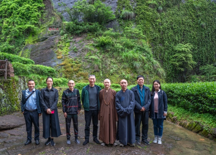 参访结束后,可祥法师一行前往武夷山九龙窠景区参观大红袍母树,何一心先生特地赶到景区陪同参观。据姚芳介绍,九龙窠景区实际为茶叶种子库,种类过百,生长于岩壁裂缝的三棵六株大红袍母树,则作为古树名木被列入世界自然与文化遗产,价值深厚。母树对面岩脚设有茶寮,供过往游客歇息、品茗。