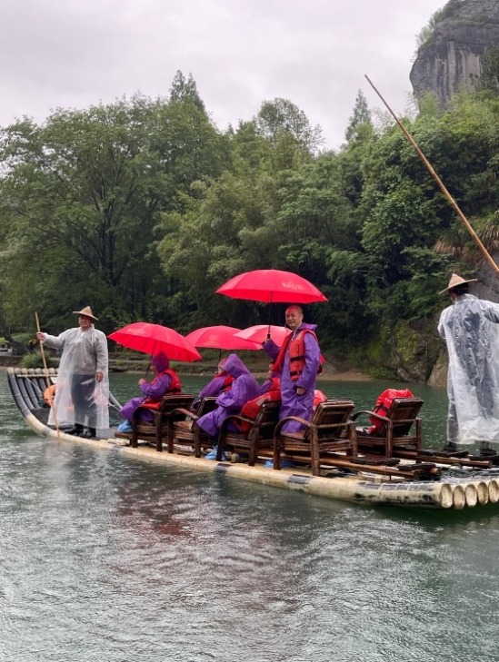 是日下午,可祥法师一行从九曲溪竹筏3号码头乘竹筏出发,顺流而下,在溪中畅游40分钟后,一行人从飞云楼下竹筏码头上岸返回住地。受疫情影响,九曲溪游客锐减,惟有两只竹筏载人在烟雨中体验山环水转,水绕山行的愉悦之感,甚为可惜。