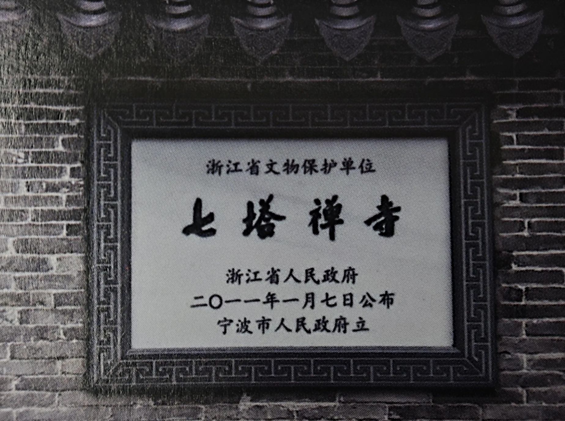 早在1981年2月10日,七塔禅寺已由宁波市人民政府列为“市级重点文物保护单位”。2011年1月7日,七塔禅寺又由浙江省人民政府升级认定为“文物保护单位”。但因没有找到合适的参照碑,所以一直没有亮碑。2022年1月19日上午,一块由能工巧匠精制,上刻“浙江省文物保护单位 七塔禅寺 浙江省人民政府二〇一一年一月七日公布 宁波市人民政府立”字样的汉白玉碑,高高镶嵌在了七塔禅寺天王殿西侧门首的墙壁上。碑铭中的“七塔禅寺”四字,系已故当代著名书法家沙孟海先生所书,碑饰庄严,铭文典雅,给距今1164年的浙东禅林名刹增添到了别样的历史厚重感和文化气息。