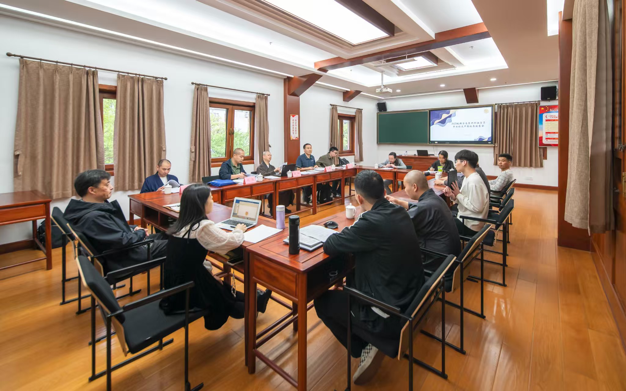 2025年4月12日上午,浙东佛教文化研究院2023级佛学高等研修班学员结业论文中期检查报告会在七塔禅寺禅学堂教室顺利举行。