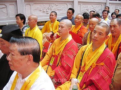 本站讯: 8月15日,宁波七塔禅寺、江东法王寺、江东区佛教协会联合,在七塔禅寺圆通宝殿隆重举行了纪念抗日战争暨反法西斯战争胜利60周年祈祷世界和平法会,来自七塔禅寺、法王寺及宁波市