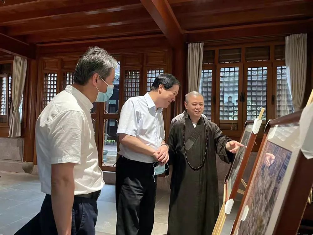 2021年7月22日上午,宁波市文化广电旅游局党组成员、副局长马荧波, 文物与博 物馆处处长李怿人 一行,在鄞州区百丈街道党工委书记葛焕陪同下,来到七塔禅寺考察古建筑修缮和文物保护工作。