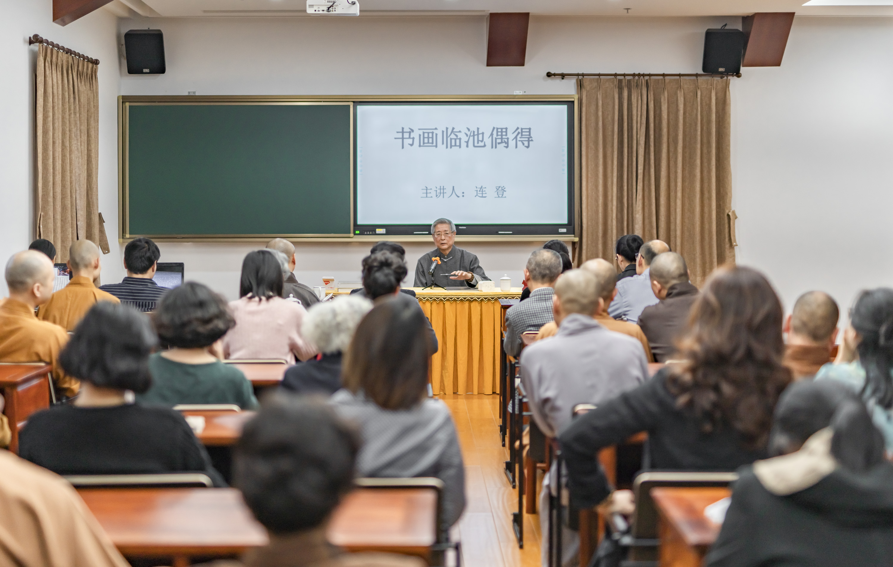 2019年5月13日下午,我国当代著名书画家、诗人连登老师应浙东佛教文化研究院、宁波市书法家协会、栖心图书馆邀请,在七塔禅寺禅学堂科教室作书画讲座,讲座题目为“书画临池偶得”。讲座由宁波市书法家协会副