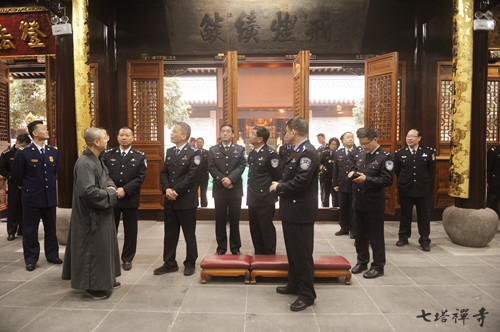 2019 年2月3日下午,市委常委、市公安局局长黎伟挺,在市公安局副局长柴大科、施大年、蔡利丰等陪同下查检指导七塔禅寺除夕夜和春节的安保工作。 在住持可祥法师及主要执事的引领下,黎伟挺局长一行