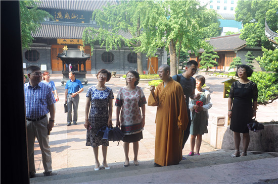 2018年7月26日,南京市人大常委会副主任、民进江苏省委副主委、民进南京市主委陈华一行参访七塔禅寺,受到住持可祥法师的热情接待。 上午9:00时,陈主任一行在可祥法师引领参观了寺内主