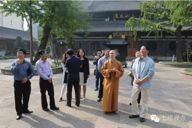 10月14日上午,宁波市人大常委会党组副书记、副主任邬和民等一行来到七塔禅寺调研工作,受到住持可祥法师等接待。 上午9时,邬主任等一行参观了寺院主要建筑。随后,一行在丈室座谈交流,可祥法师向邬主任等
