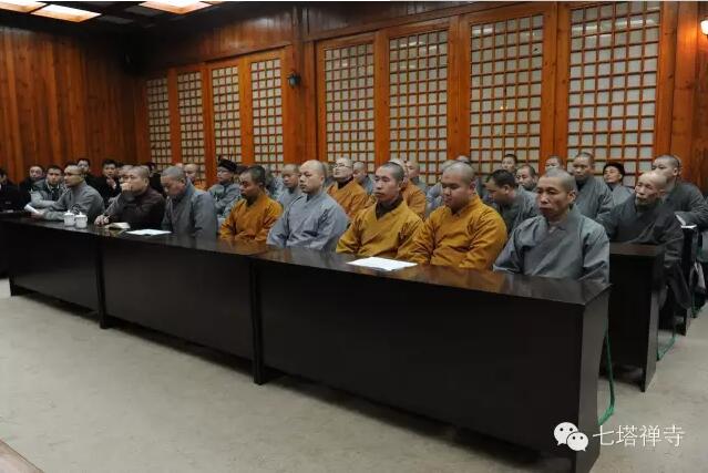 2016年2月5日晚6点,七塔禅寺2016年除夕春节安全工作动员大会,在玉佛楼举行。七塔禅寺监院、安全工作副组长界义法师宣布各安全工作小组的岗位、分工、人员配备、职责和纪律。七塔禅寺住持、安全工作组长