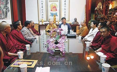座 谈 2008年11月24日下午,日本曹洞宗宝庆寺住职(方丈)田中真海和尚与龙洞院东堂村上博优先生一行24人来七塔禅寺参访,受到本寺方丈可祥大和尚和监院界义法师、定昌法师等的热情接