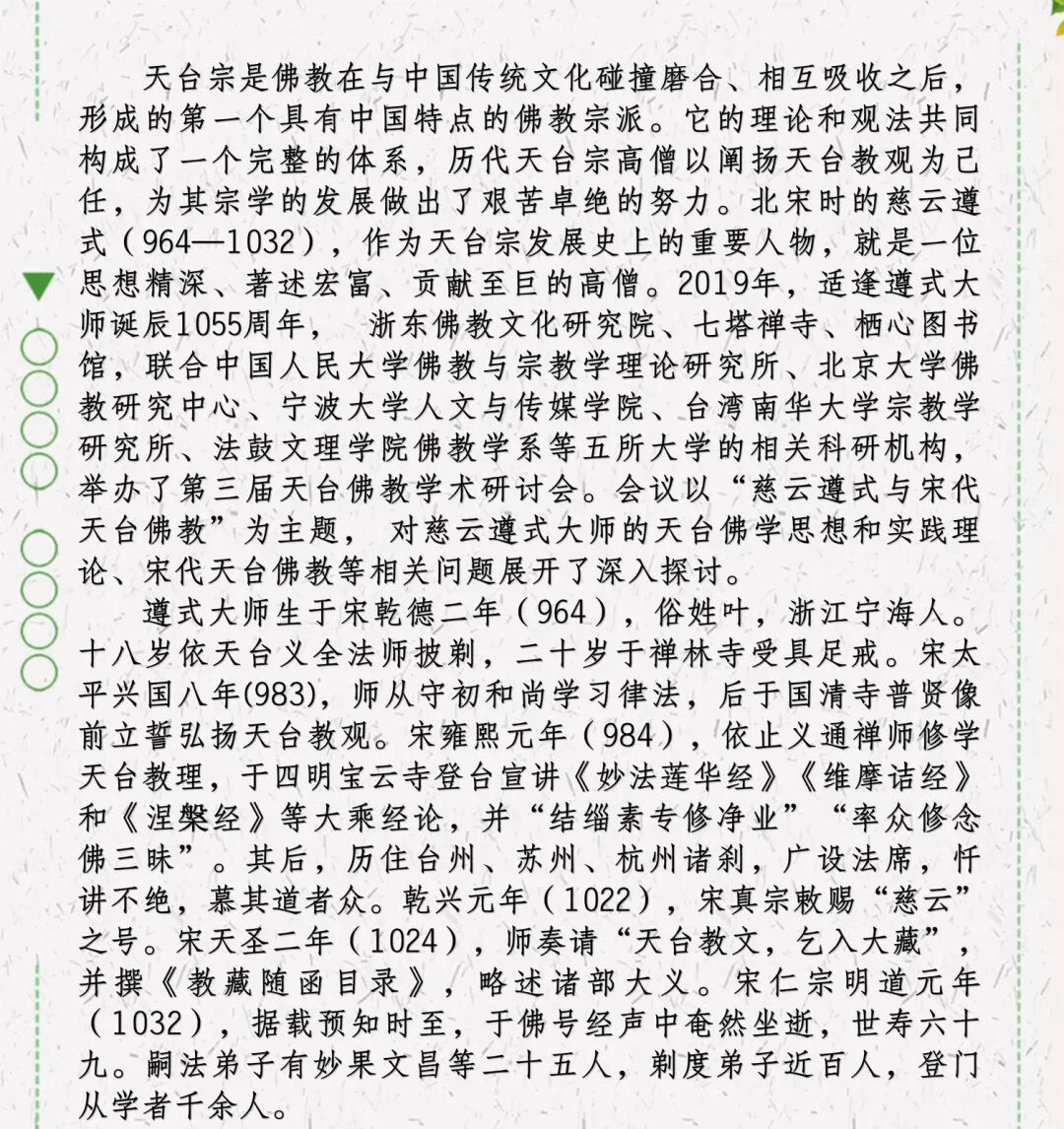 2019年,时值遵式大师诞辰1055周年。为纪念这位北宋天台宗山家派的著名高僧,七塔禅寺以“慈云遵式与宋代天台佛教”为主题举办了第三届天台佛教学术研讨会,邀请海峡两岸二十余所高校和科研院所的30多位专家学者撰文对遵式大师的教理思想、宗教实践、生平事迹和历史贡献等方面进行了全面深入的研究。2021年2月,研讨会论文集《天台佛学研究 第三辑:慈云遵式纪念专辑》正式由宗教文化出版社出版,并收入“七塔报恩丛书”系列。