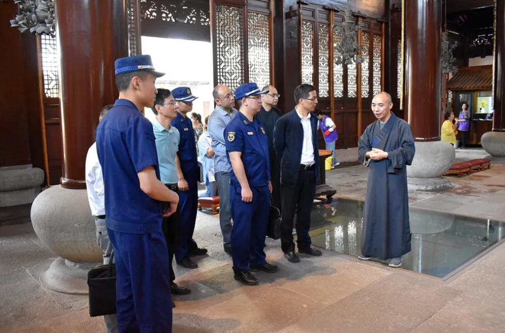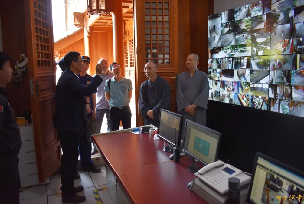 罗军雷一行在七塔禅寺监院界义法师的陪同下实地考察了寺院微型消防工作站、主要殿堂、消防安全监控室、配电房等消防重地,听取了界义法师关于寺院电路设计和改造、“智慧消防”工程和消防安全制度建设等方面的情况介绍。