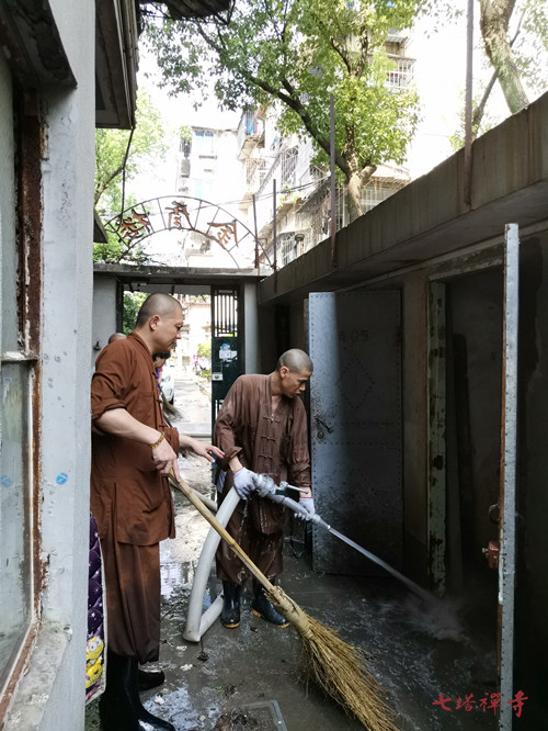 2019年8月12日,七塔禅寺副监院常明法师带领七塔禅寺的法师和义工团队,前往寺院附近的划船社区,义务参与清淤工作。
