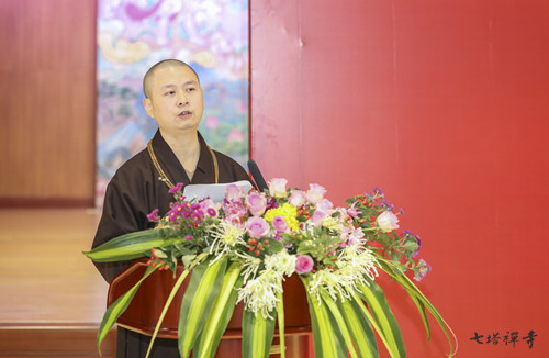 可祥法师致欢迎词,他代表主办方向出席仪式和参加学术研讨会的各位领导、大德法师、专家学者表示热烈欢迎和崇高敬意;向原国家宗教事务局及省市区民宗部门对本次研讨会的大力支持表示衷心的感谢;向合作方提供的学术支持表示由衷感谢。他讲到,今年恰逢知礼大师圆寂990周年,特以“四明知礼与宋代天台佛教”作为第二届天台佛教学术研讨会的主题。知礼大师是宋代天台宗理论与实践兼具的高僧,是“山家派”之中心人物。在天台义理上,他提出的“立阴观妄”“别理随缘”“究竟蛣蜣”“理毒性恶”“色具心具”等学说极具创建性,既丰富了天台宗教学,又促进了宋代天台的全面复兴。知礼大师一生著述宏富、讲忏不辍,纪念这位饮誉于四方的一代高僧就要研究他的教学理论,研究他的教学理论就是对他最好的纪念。包括宁波在内的浙东地区佛教底蕴深厚,是史上南方佛教传播的一个中心,又是史上韩日僧侣参访求法和文化交流的目的地。围绕浙东佛教的历史、人物、典籍、建筑和对外交流等方面进行深入研究,既符国家全面复兴中华传统文化的基本国策,也符合建设浙江文化强省的总要求。有鉴于此,七塔禅寺成立“浙东佛教文化研究院”,并对宁波市民宗局和鄞州区民宗局的大力支持,浙江省民宗委的批准同意深表感谢。浙东佛教文化研究院将依托宁波城市的区位优势和栖心图书馆的藏书资源,借助学术界的科研力量,对域内佛教历史文化等方面展开系统地研究,为人文社会科学的繁荣发展,为区域经济文化建设,为“名城名都”建设作出贡献。